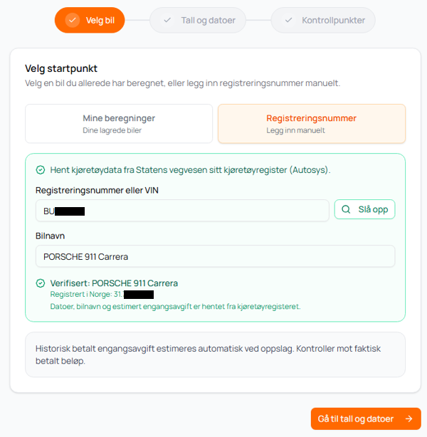 Starte fra lagrede biler i Mine beregninger eller slå opp direkte på registreringsnummer eller VIN