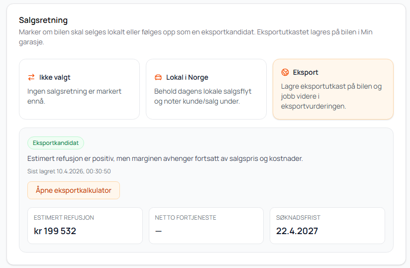 Eksportkalkulatoren samler dette i ett løp. Det gjør det lettere å sortere mellom biler som ser lovende ut, biler som må undersøkes nærmere, og biler som sannsynligvis ikke er verdt tiden.