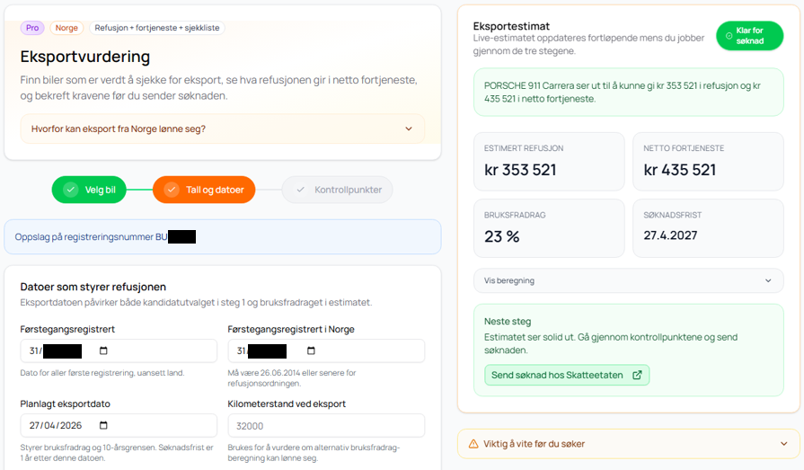 I Pro får du den faktiske eksportkalkulatoren som egen integrert funksjon per bil i Min Garasje. Her blir eksport en del av arbeidsflyten, ikke bare noe du vurderer ved siden av.